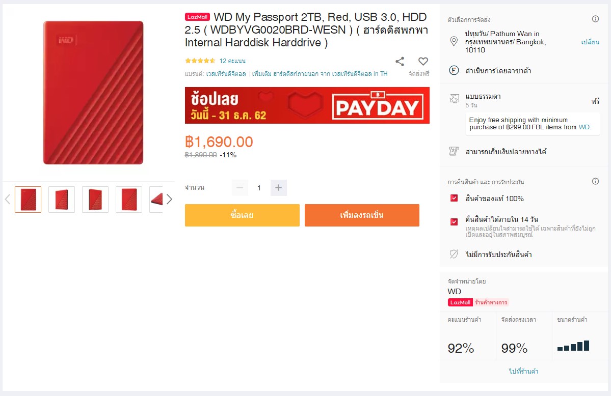 6. WD My Passport 2TB, Red, USB 3.0, HDD 2.5 ( WDBYVG0020BRD-WESN ) วาร์ป >