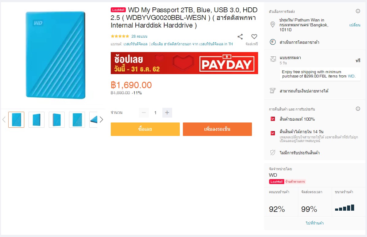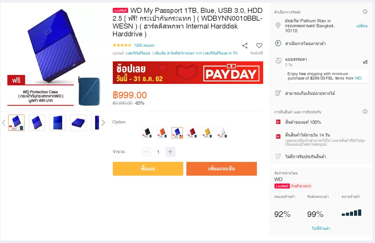 3. WD My Passport 1TB, Blue, USB 3.0, HDD 2.5 [ ฟรี! กระเป๋ากันกระแทก ] ( WDBYNN0010BBL-WESN ) วาร์ป >