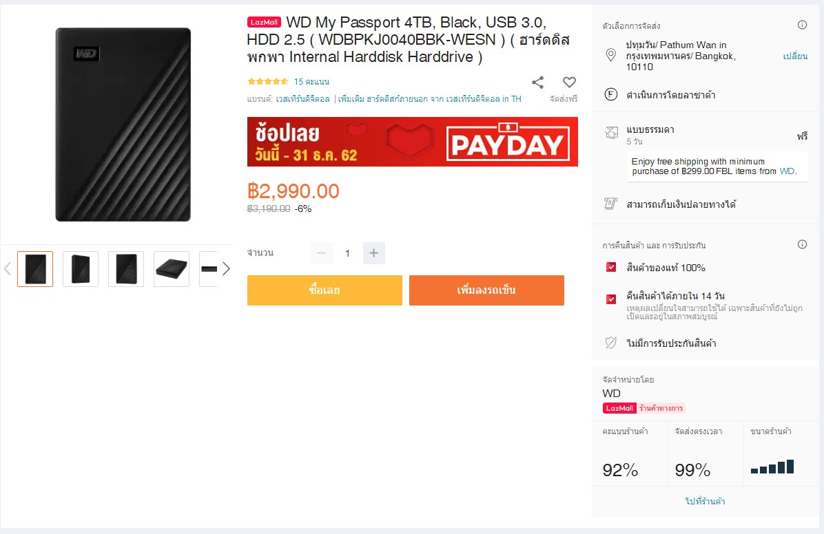 7. WD My Passport 4TB, Black, USB 3.0, HDD 2.5 ( WDBPKJ0040BBK-WESN ) วาร์ป >