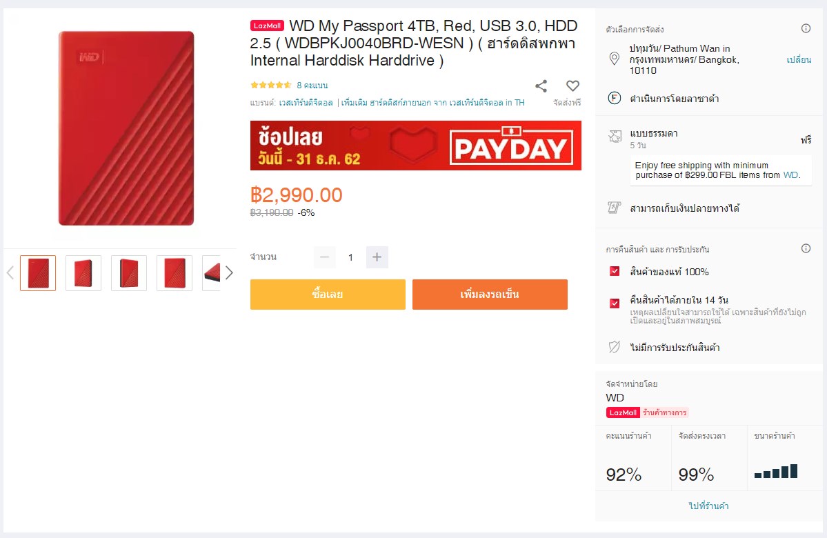 8. WD My Passport 4TB, Red, USB 3.0, HDD 2.5 ( WDBPKJ0040BRD-WESN ) วาร์ป >