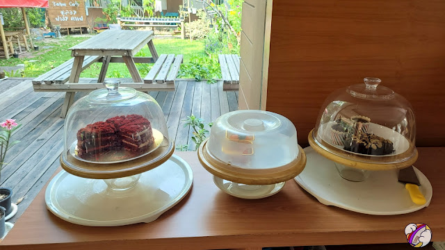 มีขนมเค้กล่วยย รอดแล้วเราแต่เอ… บรรกาศแบบนี้ซัดเค้กคงไม่ไหว +_+ หมายถึงบรรยากาศตัวเองอยากได้ข้าวกับอะไรเผ็ด ๆ กับของเย็น ๆ มากกว่ามานั่งจิบกาแฟ กับเค้กมันไม่ใช่ Target เรา