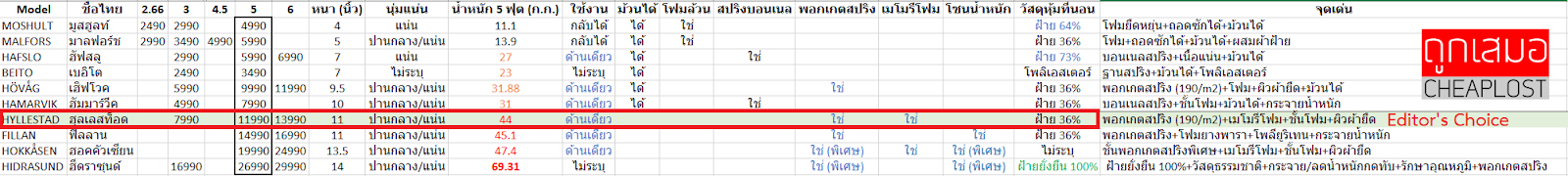 😎 Hyllestad เป็นที่นอนพอกเกตสปริง (11,990) ที่นอนสบาย ไม่นุ่มยวบแต่กำลังดี ถ้าเขยิบได้อีกนิด และไม่มีโปรของพวกยี่ห้อทอปๆ อย่าง Dunloppillo, Sealy, Slumberland ลดราคา ตัวนี้ก็จบนะ